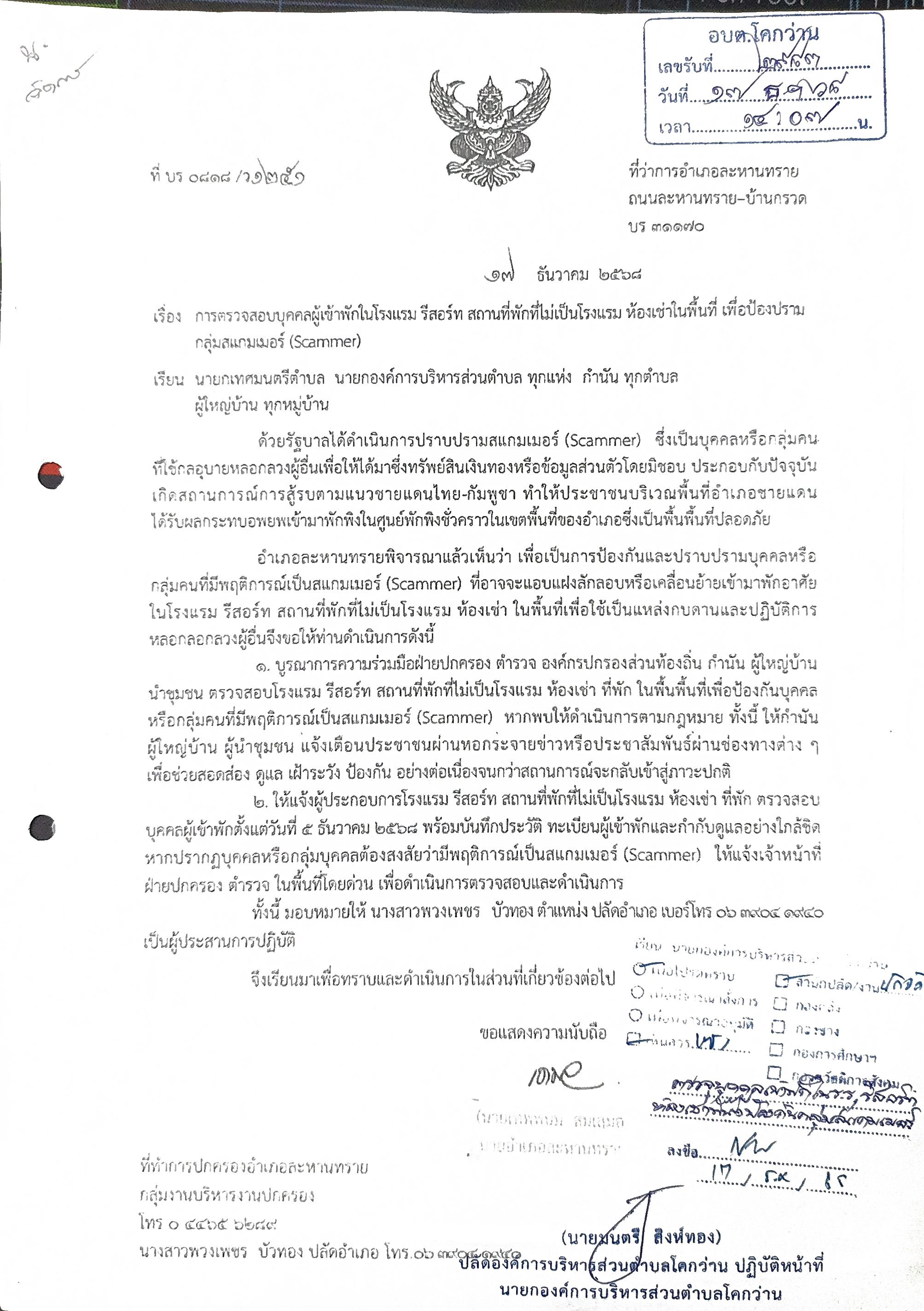 การตรวจสอบบุคคลเข้าพักในโรงแรม รีสอร์ท สถานที่พักที่ไม่เป็นโรงแรม ห้องเช่าในพื้นที่ เพื่อป้องปรามกลุ่มสแกมเมอร์(scammer)